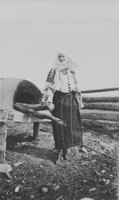 Front view of Cornelia Wood in Ukrainian Costume outside by a wood burning oven, Stony Plain.